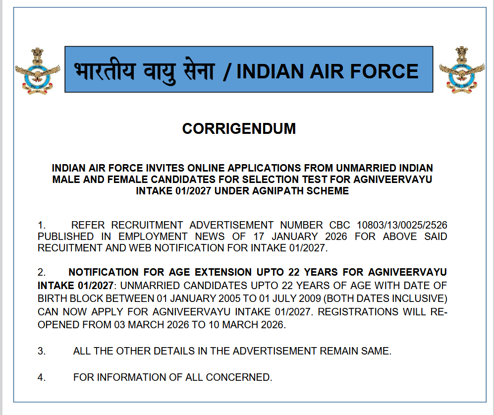 The Indian Air Force (IAF) has re-opened the Online Application Form for Agniveer Vayu Intake 01/2027. Candidates who missed the first application window or wish to make corrections now have another chance to apply. The Re-Open application window started on 03 March 2026 and the last date to apply is 10 March 2026. The Online Written Examination is scheduled on 30–31 March 2026.